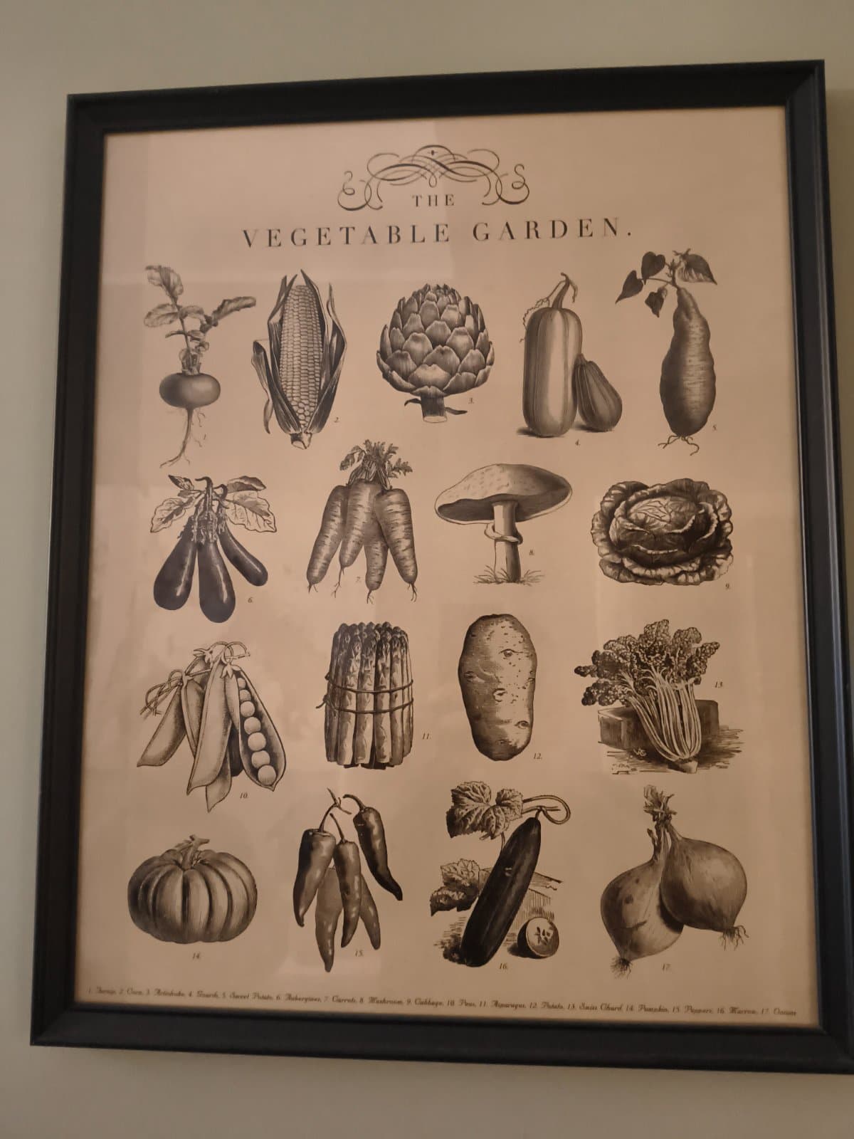 Elegante stampa botanica didattica dal titolo 'The Vegetable Garden' che presenta sedici varietà di ortaggi finemente illustrati. La composizione include rape, mais, carciofo, melanzane, carote, funghi, cavoli, patate, piselli, zucche, peperoni, cetrioli, cipolle e altre verdure, tutte rappresentate con precisione scientifica e notevole qualità grafica. L'opera presenta una raffinata incorniciatura in legno nero che valorizza la tonalità seppiata della stampa. Si tratta di un esempio caratteristico delle tavole didattiche utilizzate a scopo educativo e decorativo tra fine Ottocento e inizio Novecento.