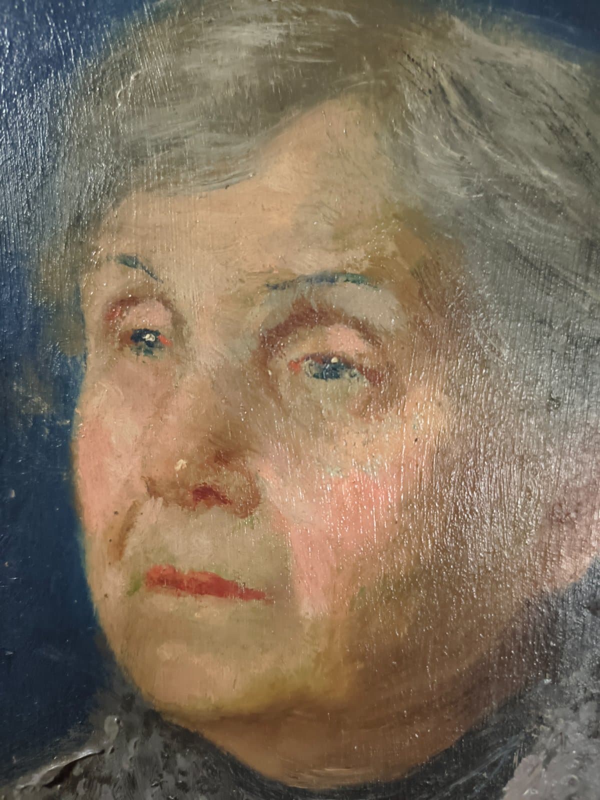 Ritratto intimista di donna anziana dai capelli grigi raccolti, raffigurata di tre quarti su fondo blu intenso. La figura indossa uno scialle grigio scuro con motivo puntinato e presenta un'espressione malinconica e pensierosa. L'esecuzione pittorica mostra una tecnica tradizionale con particolare attenzione alla resa dei volumi del viso e ai toni caldi dell'incarnato. L'opera riflette il gusto del ritratto borghese di fine XIX secolo, caratterizzato da una narrazione psicologica diretta e sincera. La cornice dorata originale completa armoniosamente la composizione.