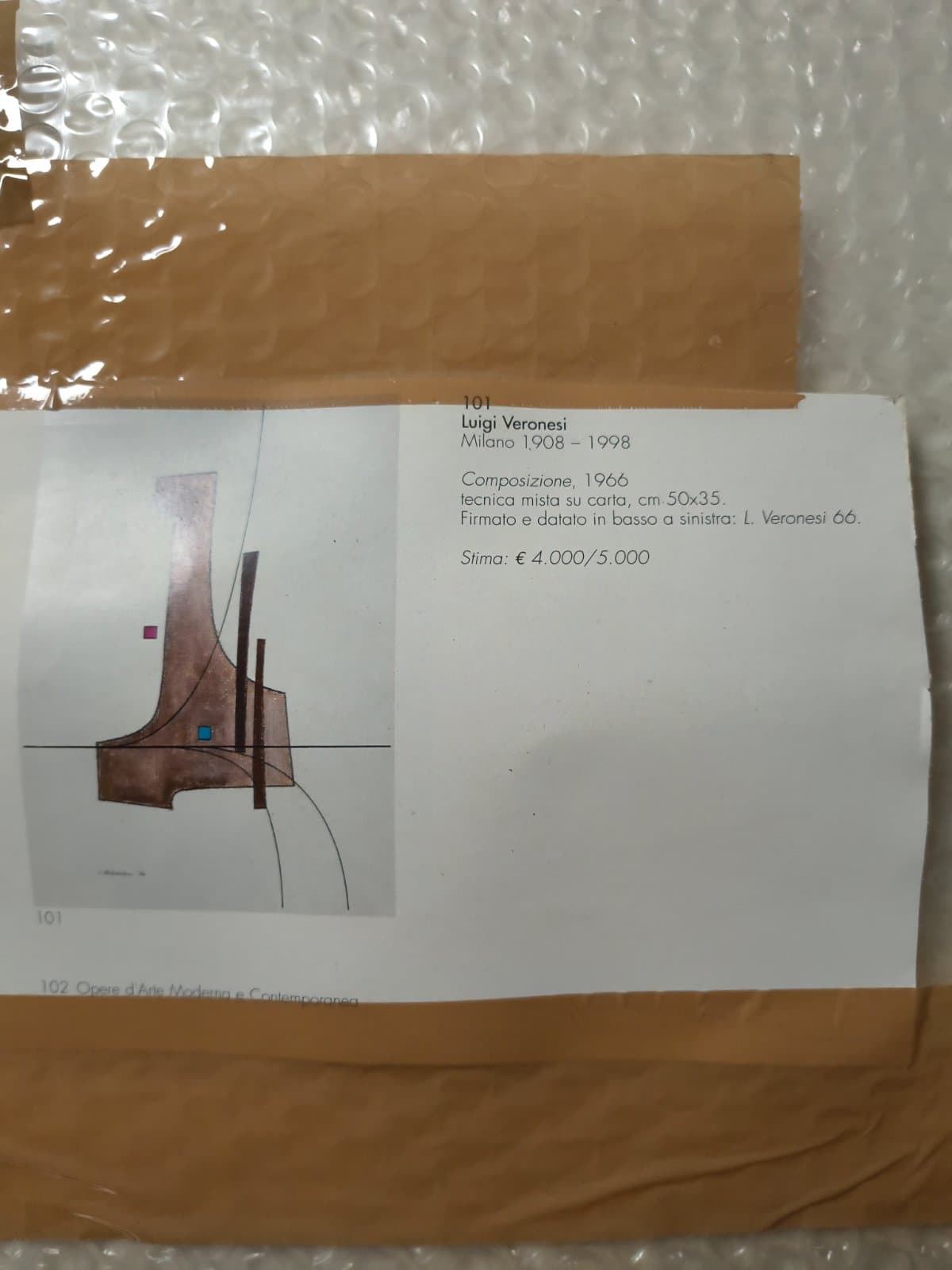 Opera firmata in basso a sinistra 'L. Veronesi '66'. Presente etichetta identificativa con titolo 'Senza Titolo', anno 1966 e dimensioni. La cornice presenta segni di usura e piccole mancanze nella doratura. L'opera è protetta da vetro con alcuni riflessi visibili nella fotografia.