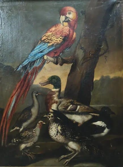 Raffinato dipinto di natura morta raffigurante un coloratissimo pappagallo dalle piume rosse e blu posato su un ramo, accompagnato da vari volatili da cortile tra cui anatre e altri uccelli acquatici. L'opera rivela la tipica maestria della scuola fiammingo-olandese nella rappresentazione naturalistica, con particolare attenzione ai dettagli del piumaggio e delle texture. Il paesaggio di sfondo, con la sua atmosfera dorata e i toni crepuscolari, conferisce profondità e suggestione alla composizione. La qualità pittorica evidenzia una mano esperta nella tradizione dei maestri nordeuropei specializzati in scene di genere e nature morte con animali. L'opera rappresenta un interessante esempio di pittura decorativa settecentesca di buon livello qualitativo.