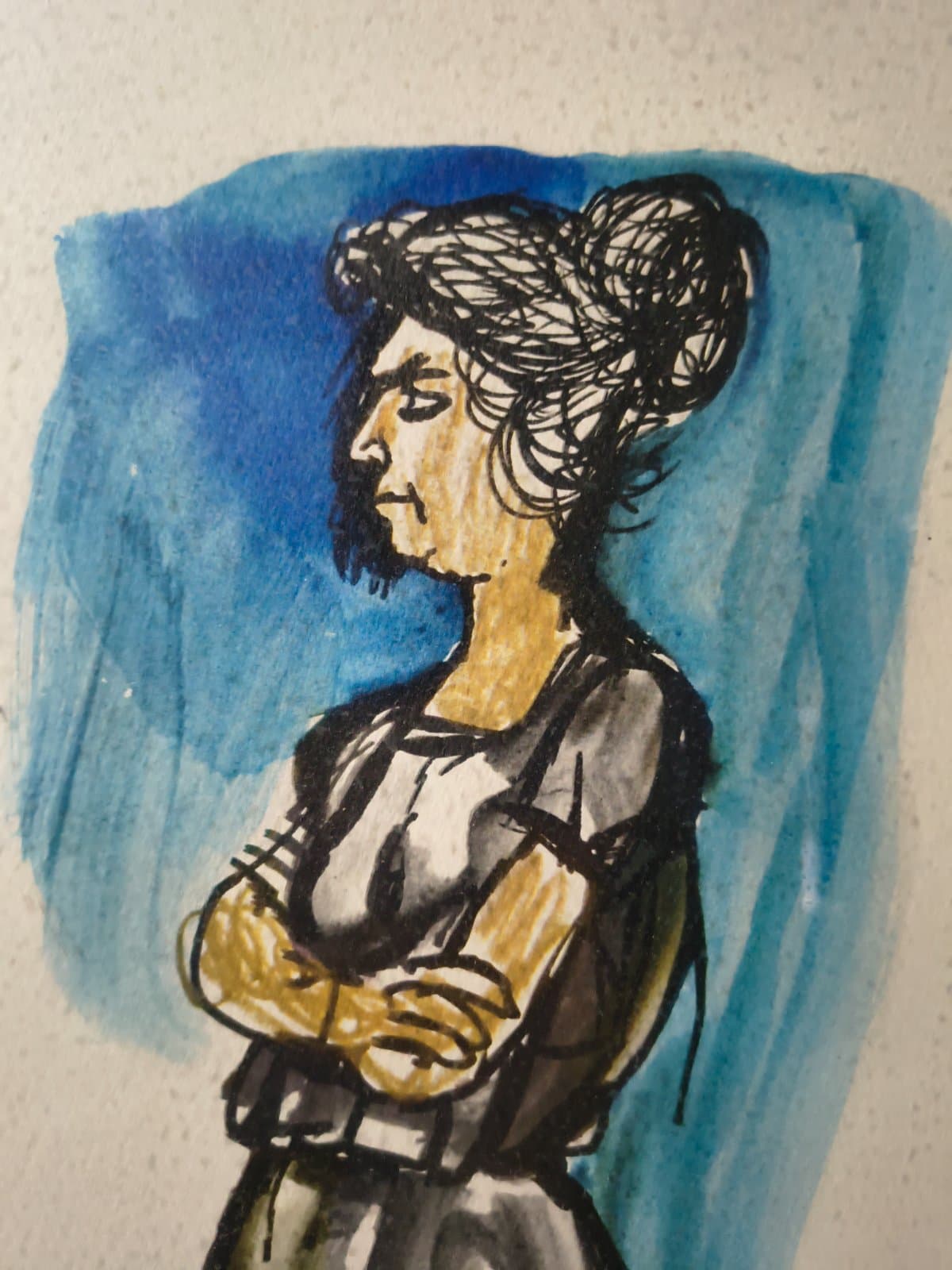 Elegante ritratto di figura femminile realizzato con tecnica mista ad acquerello e inchiostro. La donna è raffigurata in posizione eretta con le braccia conserte, indossa un abito grigio dalla linea sobria e i capelli raccolti in un'acconciatura d'epoca. Lo sfondo presenta una campiture blu che fa risaltare la figura centrale. L'esecuzione rivela una mano sicura nel tratto e nell'uso del colore, con particolare attenzione ai dettagli dell'abbigliamento e dell'espressione. L'opera è presentata in una pregevole cornice dorata con decorazioni floreali a rilievo che ne valorizza la presentazione.